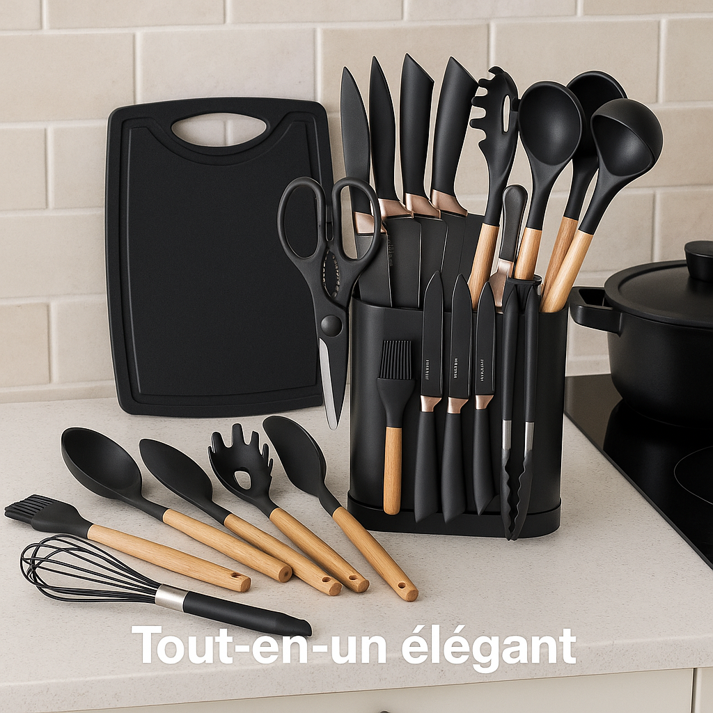 Pack complet de 20 pièces avec support design → modernise votre cuisine et remplace vos anciens ustensiles.