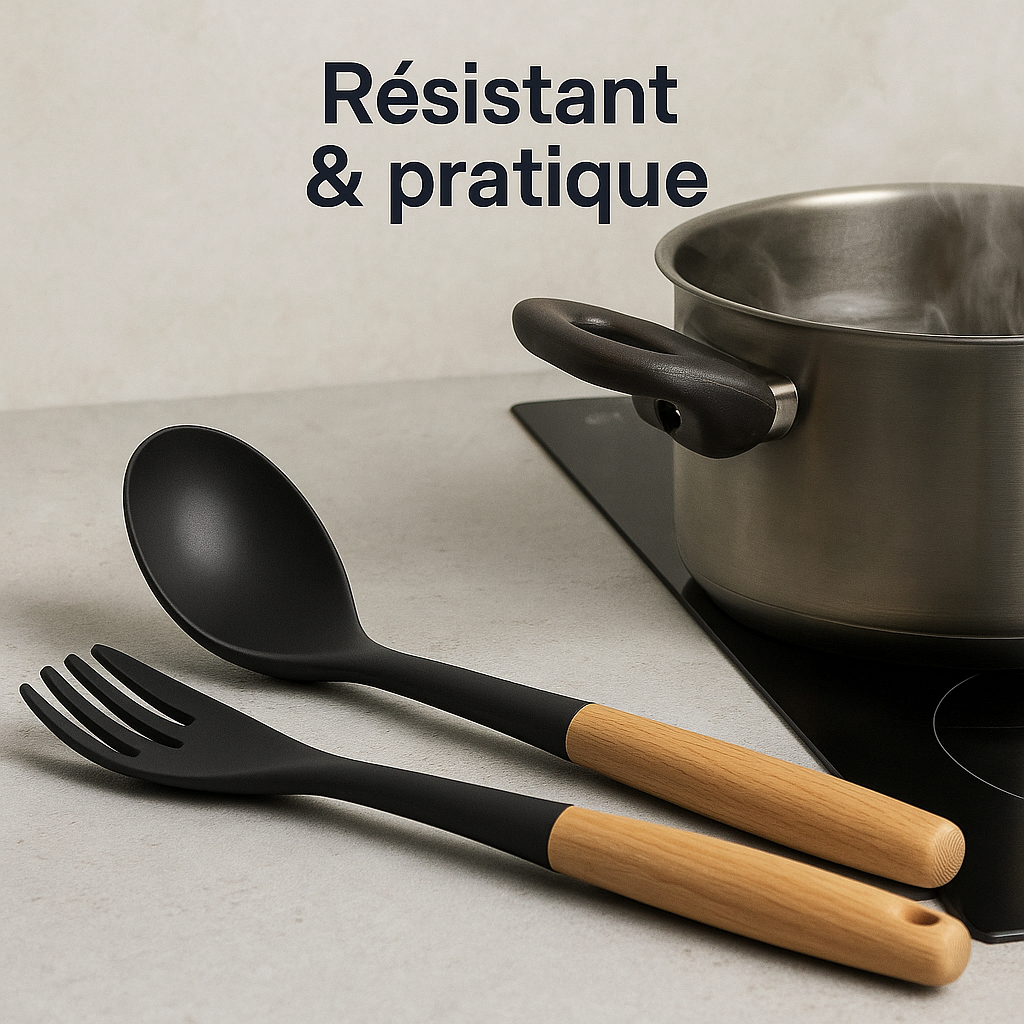 Ustensiles en silicone alimentaire anti-chaleur + manches bois ergonomiques pour cuisiner au quotidien en toute sécurité.